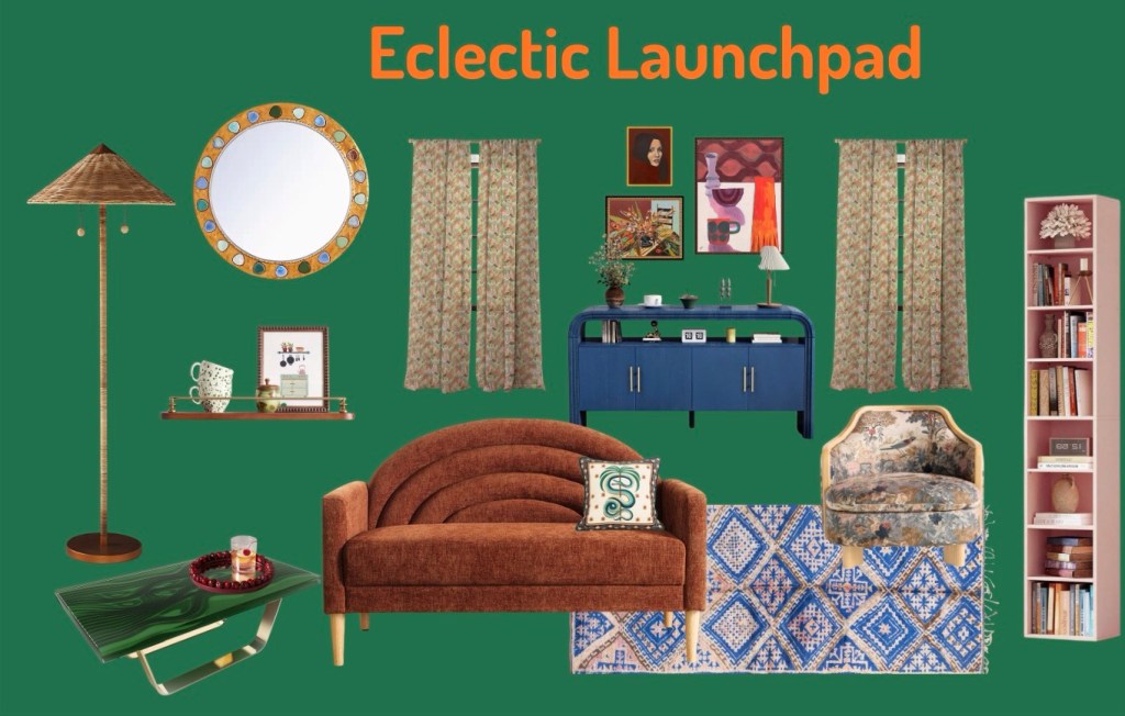 This mood board captures the playful energy of a first apartment. The kind of space where personality takes center stage and we lean a little less refined and a little more whimsy. Warm, retro inspired pieces like the rust velvet loveseat and patterned armchair mingle with bold pops of color from the credenza and jewel toned mirror. The joy of this board comes from combining what you love to this space both stylish and deeply personal. It’s eclectic, vibrant, and a perfect launchpad into adulthood.
