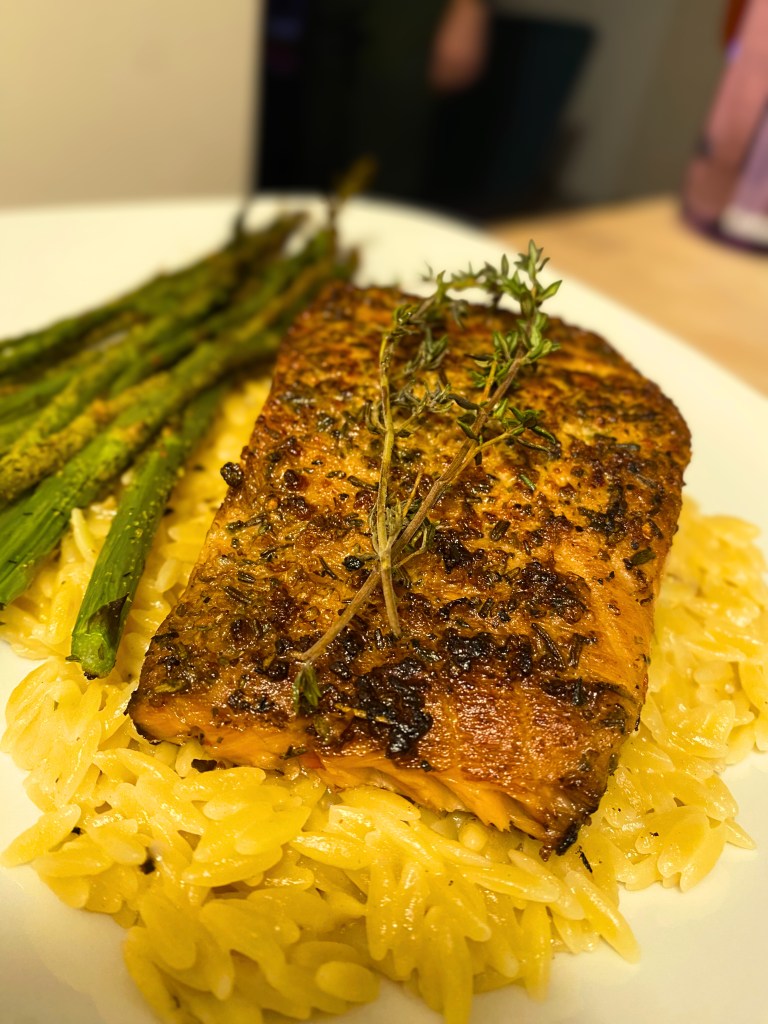 Add your filet of salmon over a scoop or two of orzo, and give an extra squeeze of lemon over it all for good measure. Plate with your favorite veggie (we eat our greens over here), and enjoy!